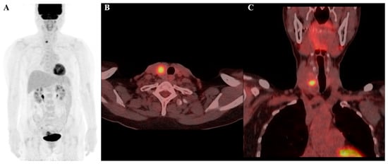 - Kim, T.Y.; Kim, W.B.; Ryu, J.S.; Gong, G.; Hong, S.J.; Shong, Y.K. 18F-Fluorodeoxyglucose Uptake in Thyroid from Positron Emission Tomogram (PET) for Evaluation in Cancer Patients: High Prevalence of Malignancy in Thyroid PET Incidentaloma. Laryngoscope 2005, 115, 1074–1078. [Google Scholar] [CrossRef]
