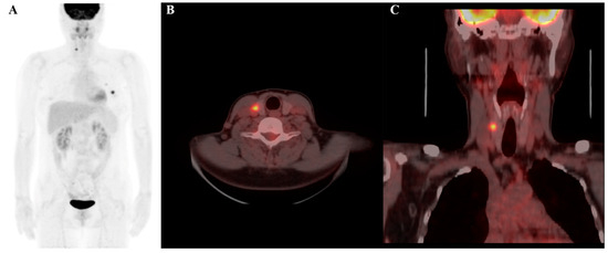 - Wartski, M.; Le Stanc, E.; Gontier, E.; Vilain, D.; Banal, A.; Tainturier, C.; Pecking, A.P.; Alberini, J.L. In Search of an Unknown Primary Tumour Presenting with Cervical Metastases: Performance of Hybrid FDG-PET-CT. Nucl. Med. Commun. 2007, 28, 365–371. [Google Scholar] [CrossRef]