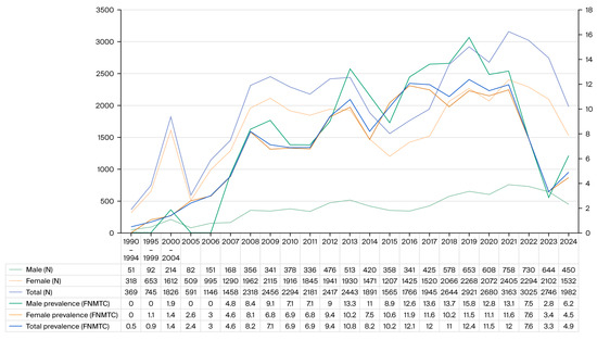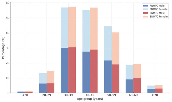 Results: Among the 46,572 NMTC patients, 3829 (8.2%) had FNMTC, and 42,743 (91.8%) had SNMTC. FNMTC was more prevalent in women and occurred at a younger age. Its proportion increased over time, peaking in the 35–59 age group. FNMTC showed higher rates of bilaterality (23.5% vs. 17.5%,