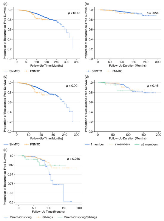 Methods: Patients with non-medullary thyroid cancer (NMTC) who had undergone surgery were classified as sporadic NMTC (SNMTC) or FNMTC based on family history. Clinicopathological features at diagnosis and surgery were compared, and prognostic outcomes were analyzed in patients with follow-up data.