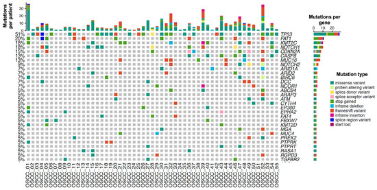 Genetic alterations in Mexican patients with oral squamous cell carcinoma. Oncoprint depicting the nucleotide variants as mutation types present in three patients or more. The upper graph represents the total number of mutations per patient, while the right graph bar represents the total number of patients with mutations in each gene. Each mutation type is color-coded according to the Mutation type legend.