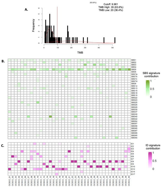 Regarding the total number of somatic mutations found in the DNA of patients with OSCC, the median TMB was determined to be 10.47 mutations per megabase (mut/Mb). The highest recorded mutation rate was 51.75 mut/Mb, whereas the lowest was 0.8 mut/Mb. For analysis and correlation with survival, TMB was categorized as high, corresponding to 20 patients (36.4%), and low, corresponding to 35 patients (63.6%) (Figure 2A).