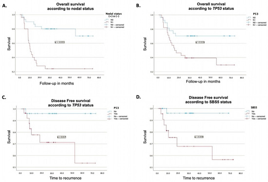 TP53 mutations were associated with the presence of metastatic lymph nodes (n = 19, 67.9% vs. n = 6, 22.2%; p = <0.001), disease recurrence (n = 7, 25% vs. n = 1, 3.7%; p = 0.025), disease persistence (n = 10, 35.7% vs. n = 3, 11.1%; p = 0.032), and disease progression (n = 10, 35.7% vs. n = 2, 7.4%; p = 0.011). TP53 was strongly correlated with the presence of lymph node metastases, as demonstrated by logistic regression analysis, with an odds ratio (OR) of 7.3 (95% CI: 2.2–24.6, p = 0.001; Nagelkerke’s R2 = 0.262). The association was also confirmed using the chi-square test (odds ratio (OR): 7.3; 95% CI: 2.2–24.6, p = <0.001).