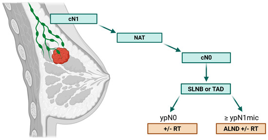 Axillary management in cN1 TNBC patients downstaging after neoadjuvant therapy. ALND: Axillary Lymph Node Dissection, NAT: Neoadjuvant Therapy, RT: Radiotherapy, SLNB: Sentinel Lymph Node Biopsy, TAD: Targeted Axillary Dissection. Created in BioRender. Bischoff, H. (2025) https://BioRender.com/pjb10vn (accessed on 2 October 2025).