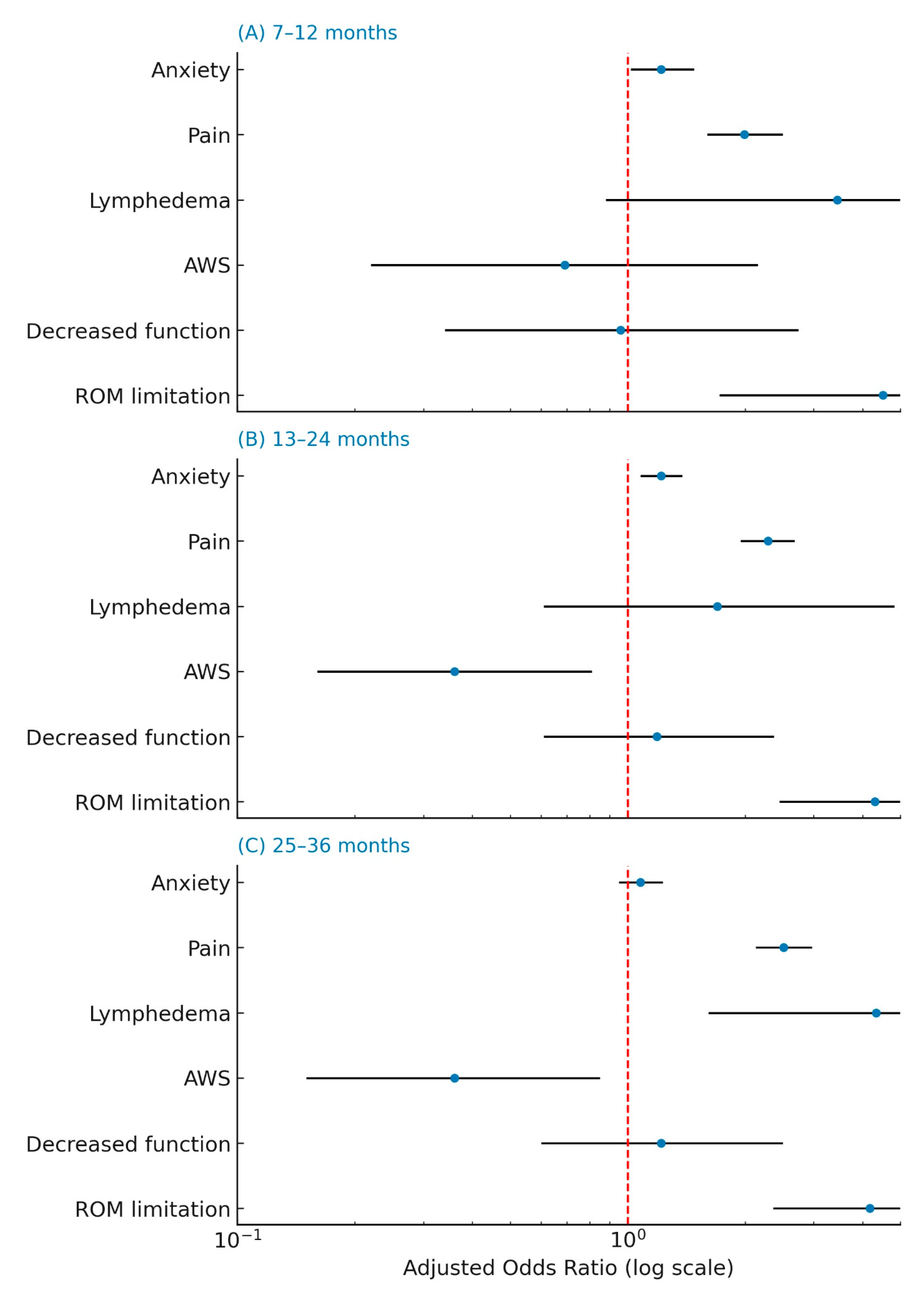 Lymphedema | 2.59 | 1.10–6.07 | 0.029 | 3.04 | 1.31–7.04 | 0.010 |