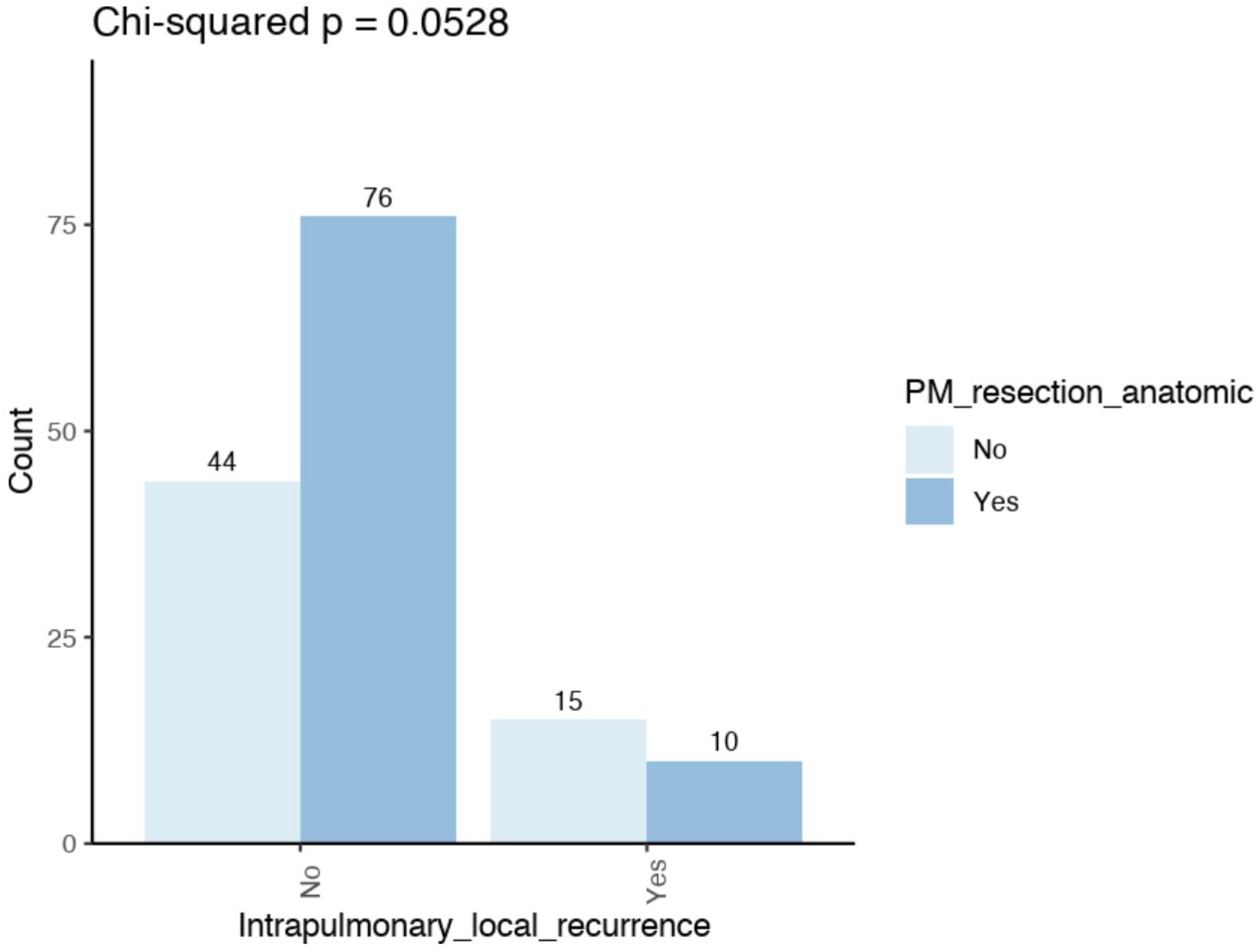 | Variable | n | Intrapulmonary Local Recurrence (%) | Chi-Squared | |