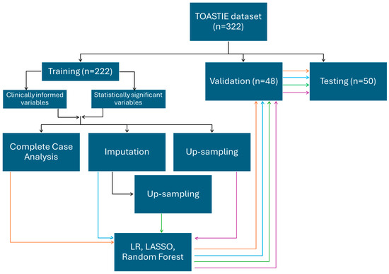 An infographic demonstrating the splitting of data into a train/validation/testing set. Using the training set, two combinations of variables and four different methods of processing are chosen. The different training sets were each used with logistic regression, LASSO and random forest for model building, which are then internally validated. Results are then reported from the testing dataset. Orange follows the route of training datatset which have been analyssed as complete case; blue by imputation; green by upsampling after imputation and purple by upsampling only.