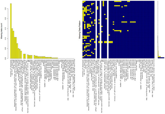 MICE plot showing that there are 5 variables where 15+% of observations are missing (“crcl_high”, “crcl_low”, “ca_stage”, “mets”, “karnofsky_ps”), with the highest being presence/absence of metastasis (27.4%). The md.pattern plot shows the number of missing data. Yellow blocks show the missing data visually in comparison to available data in blue.