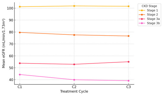 Furthermore, the baseline distribution of CKD stages according to the KDIGO classification is reported in Table 7. These findings are also illustrated in Figure 1, which shows the mean eGFR variation across treatment cycles according to baseline CKD stage.