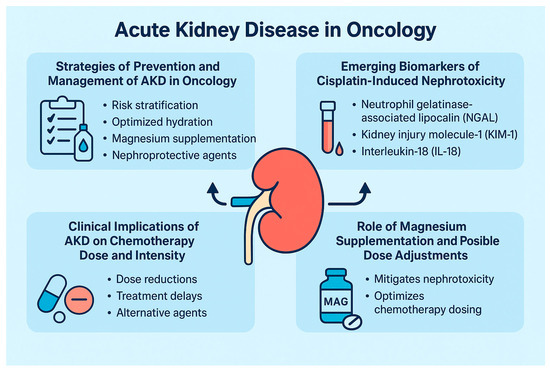 This paper has some limitations. Firstly, the single-center design and the modest sample size with a low absolute number of AKD events reduce the statistical power to identify independent predictors. Furthermore, serum magnesium levels were not systematically measured, precluding a correlation between magnesium status and renal outcomes. Additionally, GFR was only estimated and not measured with exogenous markers, affecting CKD patients with sarcopenia and normal serum creatinine. Lastly, potential unmeasured confounders such as concomitant non-steroidal anti-inflammatory drug (NSAID) use, variability in hydration adherence, and differences in supportive care practices could have influenced renal outcomes. These factors, which reflect the common clinical practice, may partly account for the heterogeneity observed. Future randomized controlled trials should stratify patients by baseline magnesium levels and eGFR to identify subgroups deriving the greatest benefit. An overview of prevention strategies, biomarkers, and clinical implications of AKD in oncology is illustrated in Figure 2.