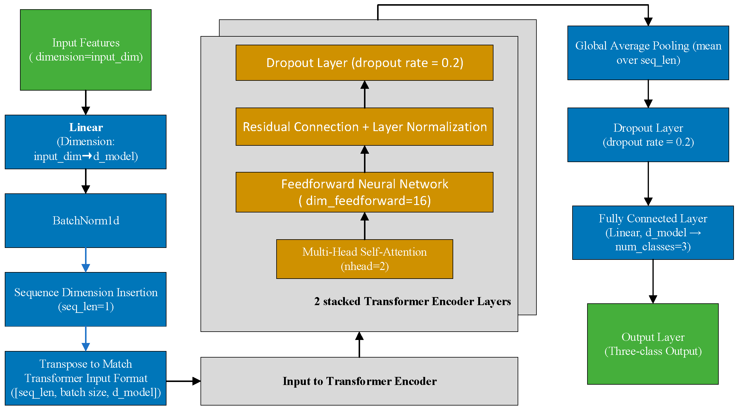 - Missing Value Handling: Samples with more than 10% missing values were excluded. For the remaining samples, missing values were imputed separately for each feature using k-nearest neighbor (KNN) imputation (k = 3) implemented in Scikit-learn (version 1.3.1, Python Software Foundation, Wilmington, DE, USA)., based on the Euclidean distance in the feature space [21,22].