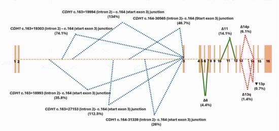 - Ben Aissa-Haj, J.; Pinheiro, H.; Cornelis, F.; Sebai, M.; Meseure, D.; Briaux, A.; Berteaux, P.; Lefol, C.; Des Guetz, G.; Trassard, M.; et al. The Identification of Large Rearrangements Involving Intron 2 of the CDH1 Gene in BRCA1/2 Negative and Breast Cancer Susceptibility. Genes 2022, 13, 2213. [Google Scholar] [CrossRef]