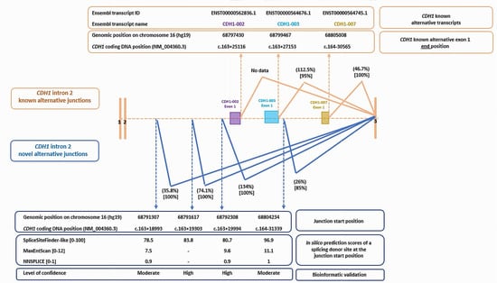Known and novel alternative splicing junctions within intron 2 of CDH1 gene: a description of genomic and coding DNA positions, level of expression (between brackets on the top) and recurrence of the splicing event (between brackets at the bottom). In silico prediction scores for splicing donor sites and bioinformatic level of confidence have been detailed for the novel alternative junctions. Known cryptic exons within intron 2 of alternative CDH1 transcripts were mentioned, and data were extracted from Ensembl Genome Browser database (https://grch37.ensembl.org/index.html (accessed on 23 May 2025)).