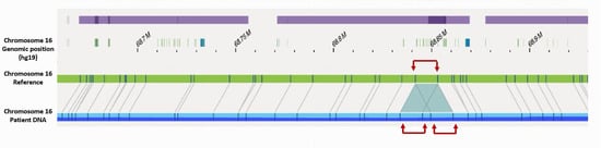 Ultra-high-molecular-weight DNA was extracted from the patient’s LCL immortalized in vitro with Epstein–Barr virus. Bionano optical genome mapping validated RNA results and confirmed that CDH1 exon 4 to exon 11 duplication was in tandem and direct on chromosome 16 (Figure 3). In addition, this approach allowed a definition of the breakpoint’s positions within CDH1 intron 3 and intron 11 on genomic DNA (chr16:68841756–68855314). The breakpoints were located within two repeated structures type AluJb (Alu Family; SINE class) suggesting a non-allelic homologous recombination (NAHR) mechanism. In addition, they had deep positions within CDH1 intron 3 and intron 11, not altering proximal and distal intronic sequences and so probably conserving the major intronic structures of physiological splicing regulation. This may explain the maintenance of the alternative splicing of CDH1 exon 11 even within the duplication.