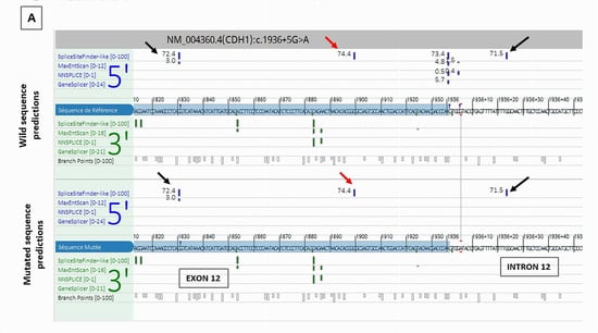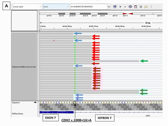 Additionally, we studied the effect on CDH1 gene splicing of four germline variants of uncertain significance (VUS) of CDH1 gene from Gustave Roussy patients’ database: CDH1 c.1008+1G>A; CDH1 c.1936+5G>A; CDH1 c.1566-10C>T and CDH1 large duplication from exon 4 to exon 11. The splicing effect of the variants were studied by the in silico prediction scores: SPiP (https://github.com/raphaelleman/SPiP (accessed on 23 May 2025)) [18] and SpliceAI (https://spliceailookup.broadinstitute.org/ (accessed on 23 May 2025)) [19]. All the patients included in this study gave informed consent for genetic analysis.