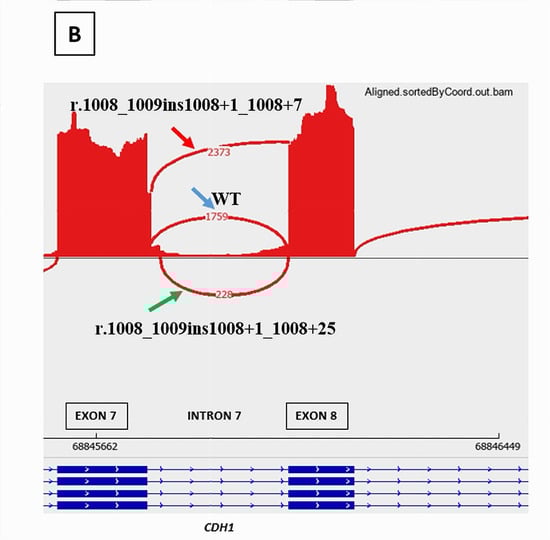 Splicing patterns and variants description were referred to CDH1 transcript NM_004360.3 (ENST00000261769.5). For the description of alternative splicing events, we used the following nomenclature, as previously described [5,9,10]: (Δx) to refer to the skip of exon “x”; (Δxp) or (Δxq) to describe the loss of the initial or terminal part of exon “x” due to the shift in a splice intronic donor or acceptor site, respectively, and (▼xp) to describe the intronic retention of the initial part of intron “x”.