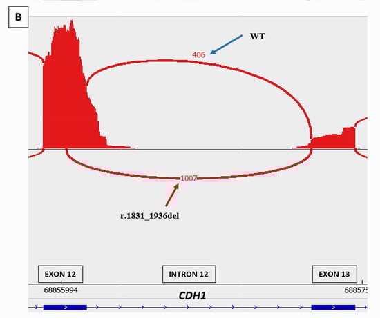 CDH1 c.1936+5G>A was predicted by SPiP to lead an alteration of the consensus splice site of CDH1 exon 12 with a risk of 98.41% [91.47% to 99.96%] for the variant to alter splicing. SpliceAI predicted the loss of the consensus splicing donor site of CDH1 intron 12 with a significant score of 0.78. This may cause the skip of CDH1 exon 12. The study of this variant is very interesting as there are three cryptic splicing donor sites predicted by SpliceSiteFinder-like tool on the wild and mutated sequences (Figure 5)—two within exon 12 and one within intron 12—and neither was predicted by SpliceAI to be used in the case of the consensus splicing donor site loss. RNAseq data of the breast tumor revealed the presence of one novel transcript CDH1 r.1831_1936del due to the use of the cryptic exonic splicing donor site at the DNA codon position CDH1 c.1830 on exon 12, causing the loss of the last 160 nucleotides of exon 12 (CDH1 Δ12q). This novel transcript was pathogenic as it was expressed at a higher level (1007 reads) than the physiological one (406 reads) and caused a disruption of the reading frame (Figure 5). We observed a significant imbalance in the expression of CDH1 pathogenic transcript compared to CDH1 wild-type transcript, with a high dominance of the pathogenic transcript and a near absence of the normal transcript, suggesting a secondary loss of expression of the wild-type allele, which could be caused by methylation of CDH1 wild-type allele.