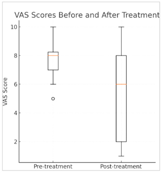 The statistical analysis was performed using SPSS v.29 software. A Wilcoxon signed-rank test was chosen to demonstrate the effectiveness of the treatment in accordance with VAS changes.