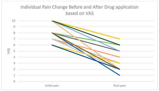 Effects of the Drug administration on VAS reported by patients (initial and final pain) With statistical significance p = 0.0000878. Each colored line represents a different patient with initial and final VAS measurements.