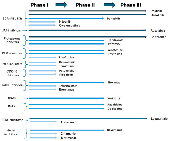 Molecularly targeted therapeutic approaches also represent a fundamental paradigm of successful precision medicine in ALL. For instance, the addition of tyrosine kinase inhibitors (TKIs) to chemotherapy has markedly improved the clinical outcomes for children with Philadelphia chromosome-positive (Ph+) ALL and is now standard in care, and, additionally, clinical trial efforts are ongoing to credit TKI-based therapy for patients with BCR::ABL1-like/Philadelphia-like (Ph-like) ALL [17,18]. The integration of next-generation sequencing (NGS) via transcriptome and genome profiling into the routine diagnostic algorithm for pediatric ALL has further allowed for the identification of new prognostic markers and optimized risk stratification, as well as guiding the selection of appropriately targeted therapies in clinical trials and compassionate use programs, and for off-label applications [19]. Several novel small molecules targeting molecular aberrations or specific molecular pathways are accordingly under preclinical and/or early-phase clinical investigation in children with relapsed leukemias (Figure 1). These agents hold promise for future integration into molecularly guided treatment strategies aimed at optimizing ALL therapy [20]. This paradigm is even more critical in the current context, marked by increasing biological complexity and the rapidly expanding landscape of novel treatment strategies and combinations. At the same time, increasingly, small patient populations with specific high-risk leukemia genetic subtypes call for strong international collaboration to ensure the feasibility of clinical trials and the generation of robust data to further improve outcomes for children with ALL. In this review, we provide a comprehensive overview of the clinical trial investigations into molecularly targeted agents in children with ALL that summarizes and discusses the available results of completed trials and highlights the state-of-the-art of ongoing and registered soon-to-open trials.