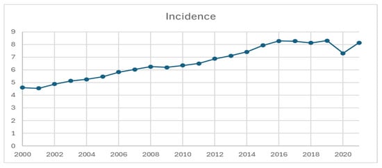 Incidence of neuroendocrine tumor from 2000 to 2021, per 100,000 persons.