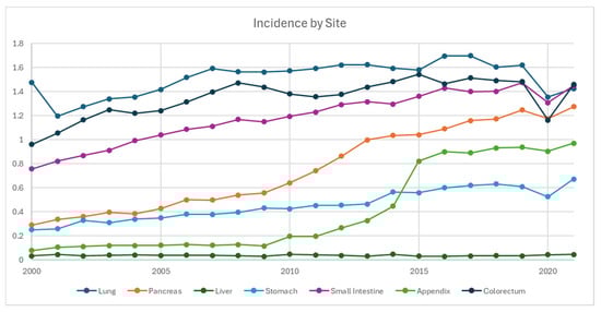 Incidence of neuroendocrine tumor from 2000 to 2021 stratified by primary site, per 100,000 persons.