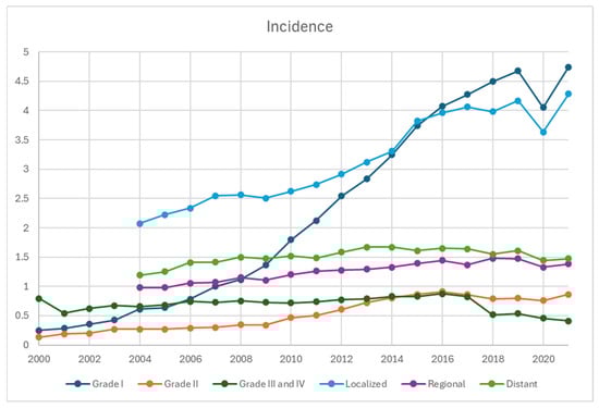 Based on staging, the incidence of local disease has been the highest and increased the most, from 2.1 per 100,000 in 2004 to 4.3 per 100,000 in 2021, whereas it increased from 0.98 to 1.4 and 1.2 to 1.5 per 100,000 in regional and distant diseases, respectively (Figure 3). Based on grading, the incidence of G1 NET demonstrated the steepest and upward-trending curve, from 0.25 in 2000 to 4.7 per 100,000 in 2021. The incidence of G2 NET also increased from 0.14 to 0.87 per 100,000, whereas it remained relatively stable for G3/G4 between 2000 and 2016 in the range of 0.54 and 0.83, which slightly trended down afterwards to 0.41 in 2021.