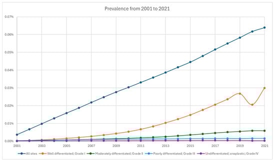 Prevalence of neuroendocrine tumor from 2001 to 2021 stratified by grade.