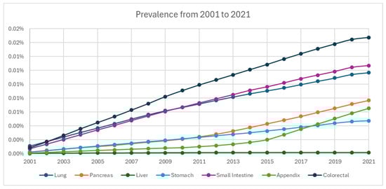 Prevalence of neuroendocrine tumors from 2001 to 2021 stratified by primary site.