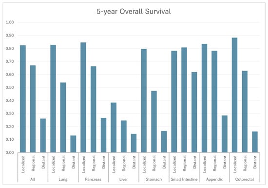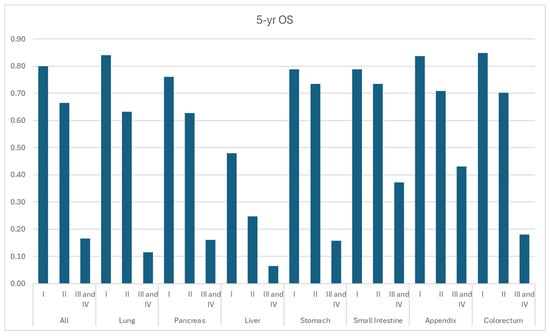 Five-year overall survival by stage and primary site.