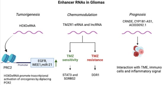 The state-of-the-art in glioma biology constitutes a setting where eRNAs are gaining importance. These mediators influence the proliferation of tumors, resistance mechanisms, especially against TMZ, and prognosis. Among currently reported eRNAs, HOXDeRNA and CRNDE have the strongest experimental validation. Since eRNA expressions tend to be tumor-specific, eRNAs stand to become important biomarkers in customized patient medicine and prospective therapeutic targets.
