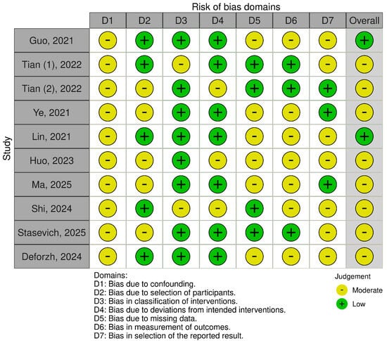 The evaluation of the methodological quality of the included studies was done by using the updated ROBINS-I tool by two independent reviewers, and any discrepancies were resolved through discussion and consensus. Risk of bias assessments were visualized through plots generated with the robvis web application (URL: https://mcguinlu.shinyapps.io/robvis/, accessed on 15 September 2025) (Figure 2).
