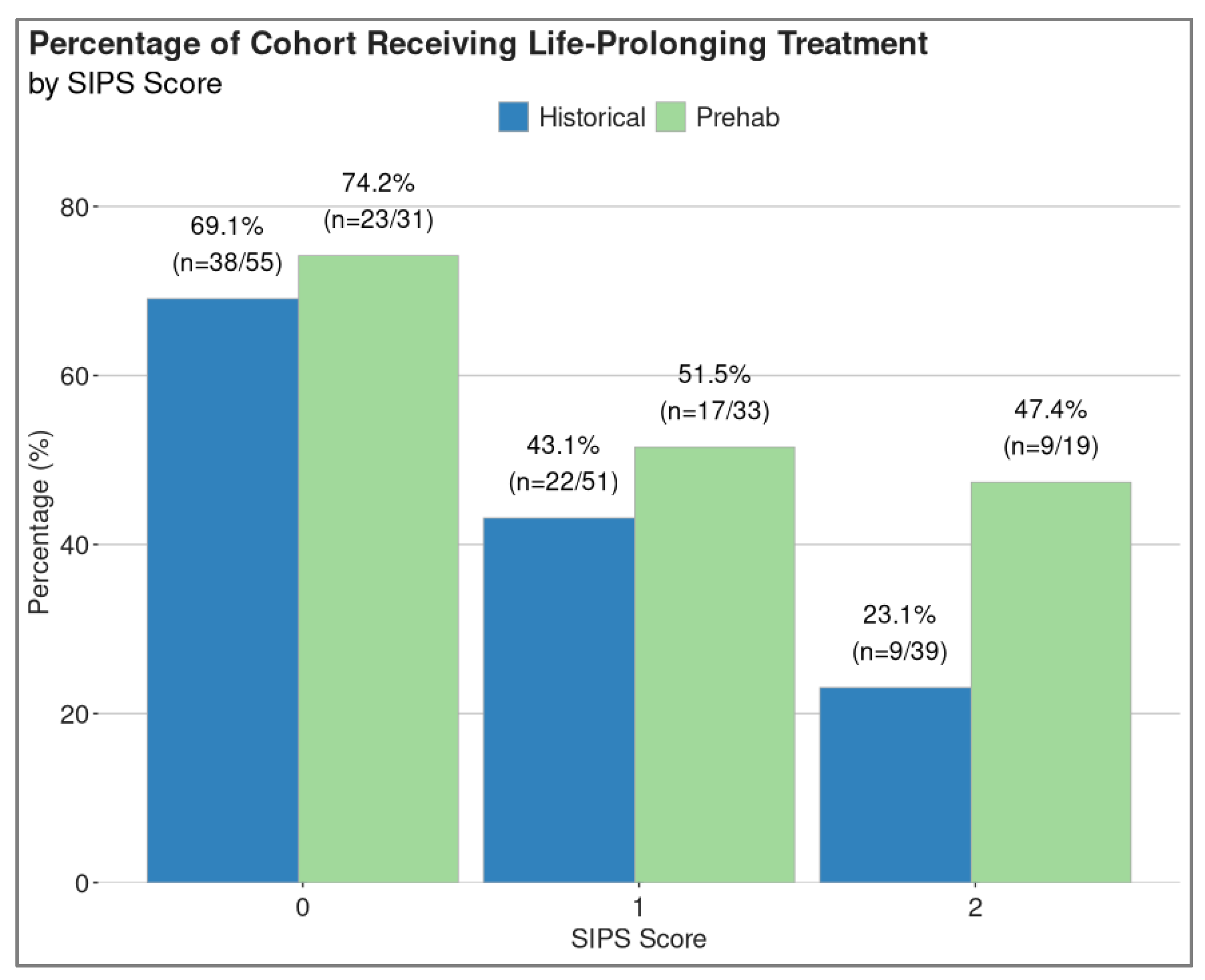 % stage 3 patients receiving life-prolonging treatment | 52 (26.1%) | 18 (18.6%) | |