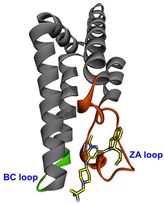 Crystal structure of the characteristic ZA and BC loops of the ATAD2-BRD (PDB ID: 7Q6T). The BRD comprises four bundles of α helices, with the ZA loop situated between αZ and αA helices and the BC loops situated between αB and αC helices. The ZA loop is highlighted in orange, and the BC loop is shown in green.