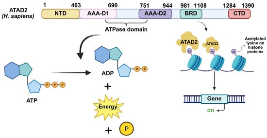 There are 1390 amino acids in ATAD2 (molecular weight 158.5 kDa), which are divided into the following domains: N-terminal domain (NTD) (residues: 1–403), bipartite domain; AAA-D1 (residues: 403–690), AAA-D2 (residues: 751–944), AAA+ ATPase domain (residues: 403–944), BRD (residues: 981–1108), and C-terminal domain (CTD) (residues: 1284–1390) (Figure 3). AAA-ATAD2 and BRD-ATAD2 are known to be highly conserved among all these domains and potential targets for therapy [27].