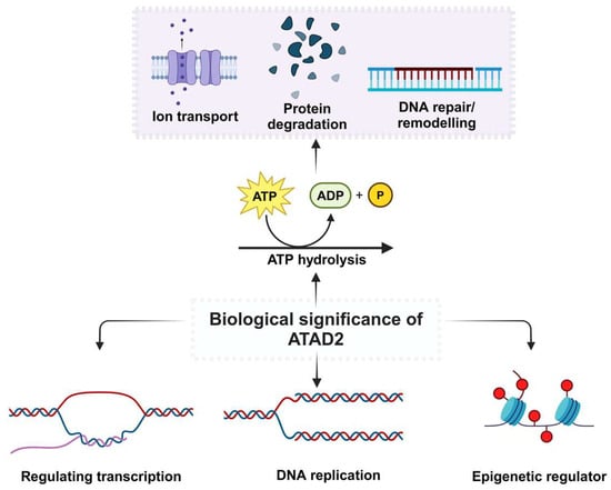 Involvement of ATAD2 in various biological processes. ATAD2 functions as an epigenetic decoder, transcription factor, and coactivator in various physiological activities, including DNA replication and transcriptional regulation, due to its BRD [47]. ATAD2’s ATPase domain, like others in the AAA+ superfamily, plays a crucial role in protein oligomerization and ATP binding and hydrolysis. ATAD2 breaks high-energy phosphate bonds and converts ATP into ADP and phosphate, releasing energy. The energy given supports essential cellular functions such as protein folding [51], intracellular transport [52], DNA repair, and ion transport [53].