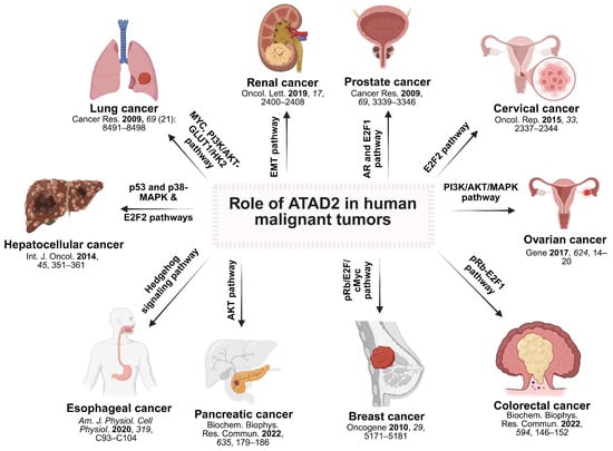 Role of ATAD2 in human malignant tumors. ATAD2 is implicated in diverse cancers, where it participates in or is modulated by multiple signaling pathways, including the Rb/E2F [40,54,55], AR/E2F1 [46], PI3K/AKT [56,57,58], MAPK [57,59], Hedgehog [60], and EMT pathways [61], among others [6,8,12,14]. While depicted separately here for clarity, these signaling routes are highly interconnected in cancer biology, often exhibiting forward–backward feedback loops. ATAD2 functions as a dynamic transcriptional co-regulator embedded within this complex network of pathways.