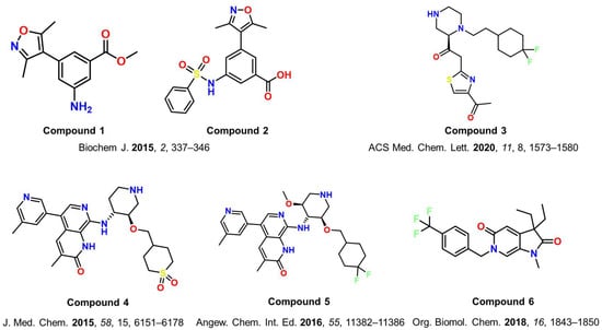 Chemical structures of some of the reported ATAD2 inhibitors discovered through structure-based drug design (compounds 1–6) [38,97,98,99,100].