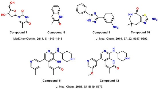 Using crystallographic fragment screening, Chaikuad et al. [95] initially identified nine novel hits with weak affinity for ATAD2 in 2014. These hits included thymidine (compound 7, Figure 7) and 3-methylquinoline-2 (1H)-one (compound 8, Figure 7). The co-crystal structure of compound 7 with BRD-ATAD2 was also reported in the RCSB protein databank (PDB ID: 5A5O). The reported fragments paved the way for the development of potential high-affinity ATAD2 inhibitors starting from these initial chemical moieties.