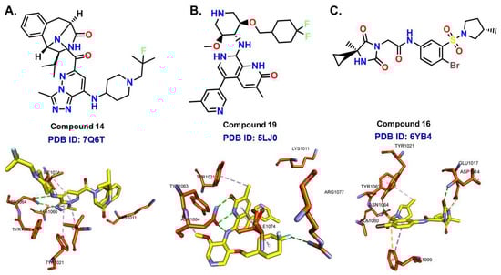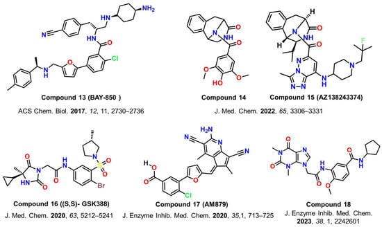 Chemical structures of some of the reported ATAD2 inhibitors discovered through virtual screening or TR-FRET-based high-throughput screening (compounds 13–18) [79,104,106,107,108].