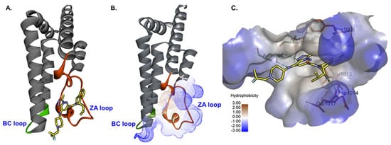Another good example of the synergy between computational and experimental work was provided by Dolbois et al. [97]. A moderate-affinity ATAD2 inhibitor (compound 3, Figure 6) with an IC50 value of 15 μM (measured through time-resolved (TR)-FRET assay) was optimized commencing from a hit molecule discovered through pharmacophore modeling. The study also mentions the flexible and adaptive nature of the ZA loop that had a significant effect on the binding of the reported ligands [97]. This study further confirmed that the gatekeeper residues Ile1074, Val1008, and Val1013 can adopt multiple orientations depending on the ligand and even when interacting with the same ligand.