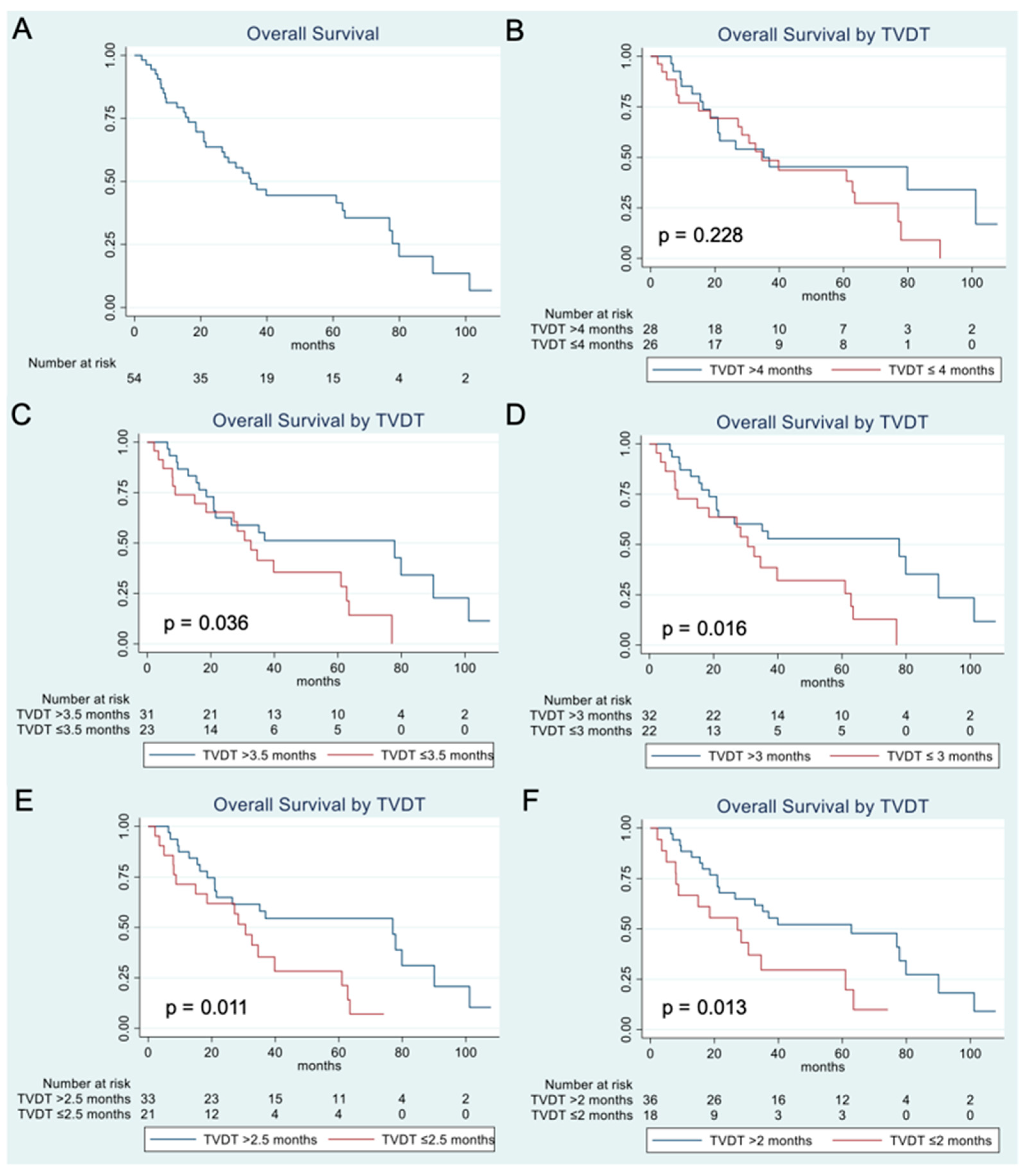 All Patients n = 54 | Rapidly Growing Tumors TVDT ≤ 2.5 Months n = 21 | Slowly Growing Tumors (TVDT > 2.5 Months) n = 33 | p-Value | |