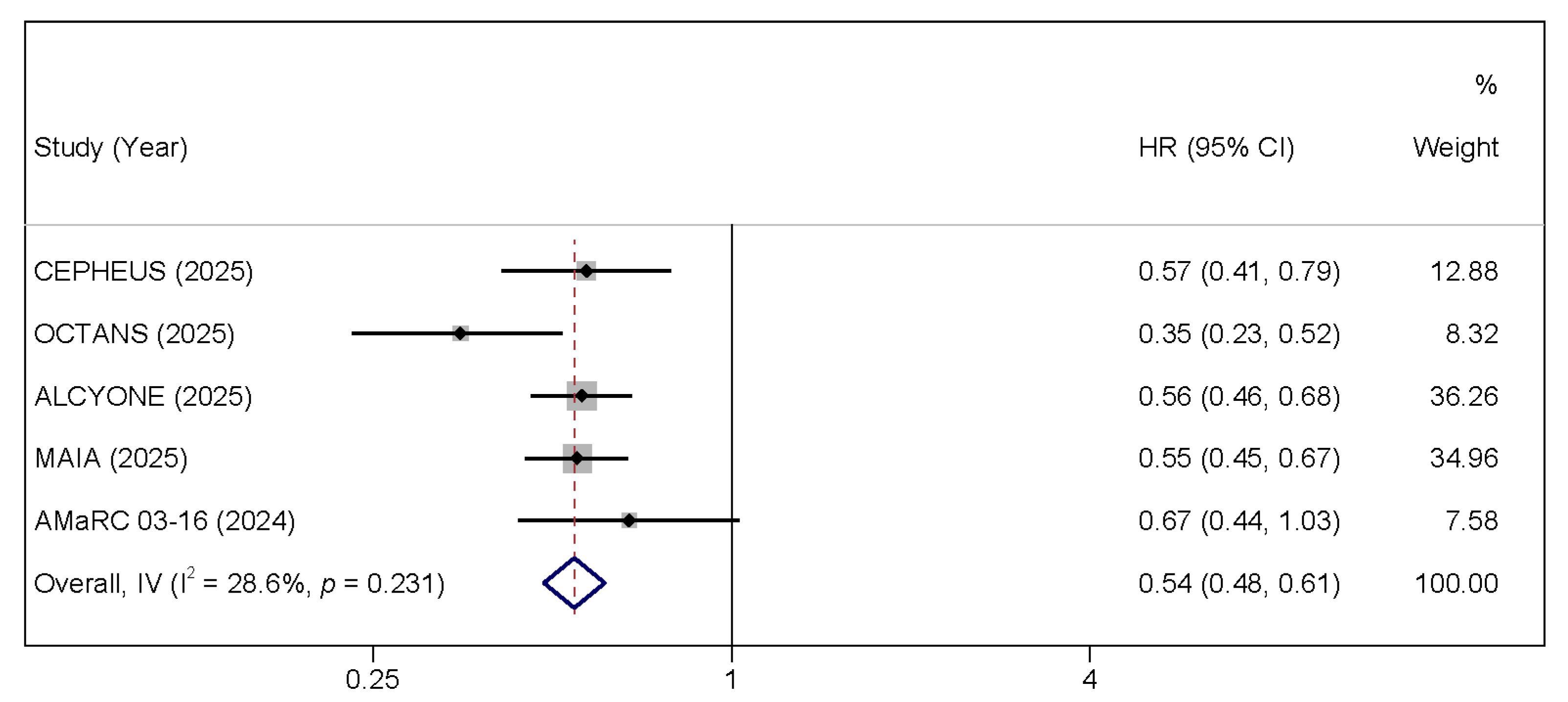 Our findings are consistent with the recent Cochrane review, which also reported significant improvements in OS (HR 0.64) and PFS (HR 0.48) with daratumumab-based regimens [20]. The present analysis extends these findings by incorporating two additional trials (CEPHEUS and GEM-2017FIT) and providing longer follow-up data, thereby strengthening the overall evidence base. Furthermore, we provide a more granular safety profile, confirming the increased risks of infections, pneumonia, and lymphopenia associated with daratumumab, which aligns with the Cochrane review’s conclusion regarding serious AEs. Pooled results from our meta-analysis showed a 45.6% reduction in the risk of disease progression or death (HR = 0.544) and a 30.7% reduction in the risk of mortality (HR = 0.693) with daratumumab-containing therapies, corroborating the robust treatment effect observed in previous meta-analyses. Additionally, daratumumab-based regimens were associated with a significantly higher rate of MRD negativity (RR = 2.322; 39.1% vs. 19.7% in controls), reinforcing its capacity to induce deep and durable responses—a well-established surrogate for long-term survival in multiple myeloma.