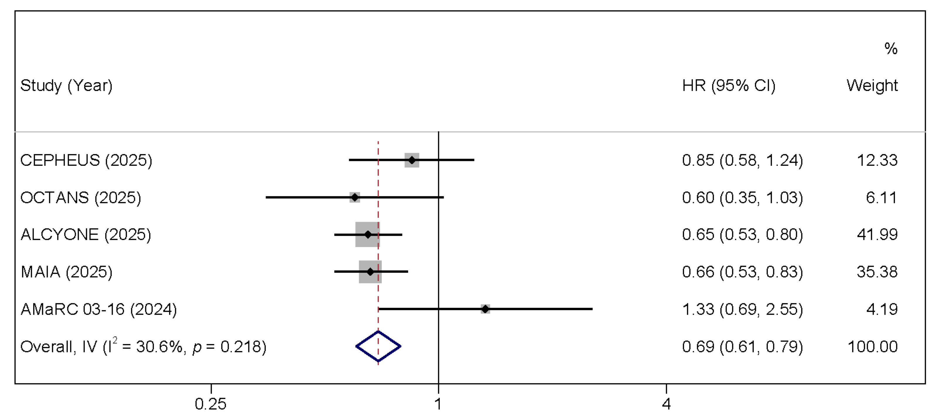 All six included studies reported PFS. As patients in the GEM-2017FIT trial were randomized (1:1:1) to VMP, KRd, or D-KRd, no direct comparison was made between KRd and D-KRd; therefore, PFS analysis was performed using data from five trials [27]. Daratumumab-based regimens significantly reduced the risk of disease progression or death compared with control therapies (pooled HR = 0.544, 95% CI: 0.483–0.612, p < 0.001), with moderate heterogeneity observed across studies (I2 = 28.6%, p = 0.231; Figure 2). This translates to a 45.6% reduction in the risk of progression or death, a substantial and clinically meaningful improvement. Similarly, OS data were available from five trials. Pooled analysis demonstrated a significant OS benefit favoring daratumumab-containing regimens (HR = 0.693, 95% CI: 0.606–0.791, p < 0.001), with moderate heterogeneity (I2 = 30.6%, p = 0.218; Figure 3). This represents a 30.7% reduction in the risk of death, confirming that the PFS benefit translates into a significant overall survival advantage for TIE NDMM patients.