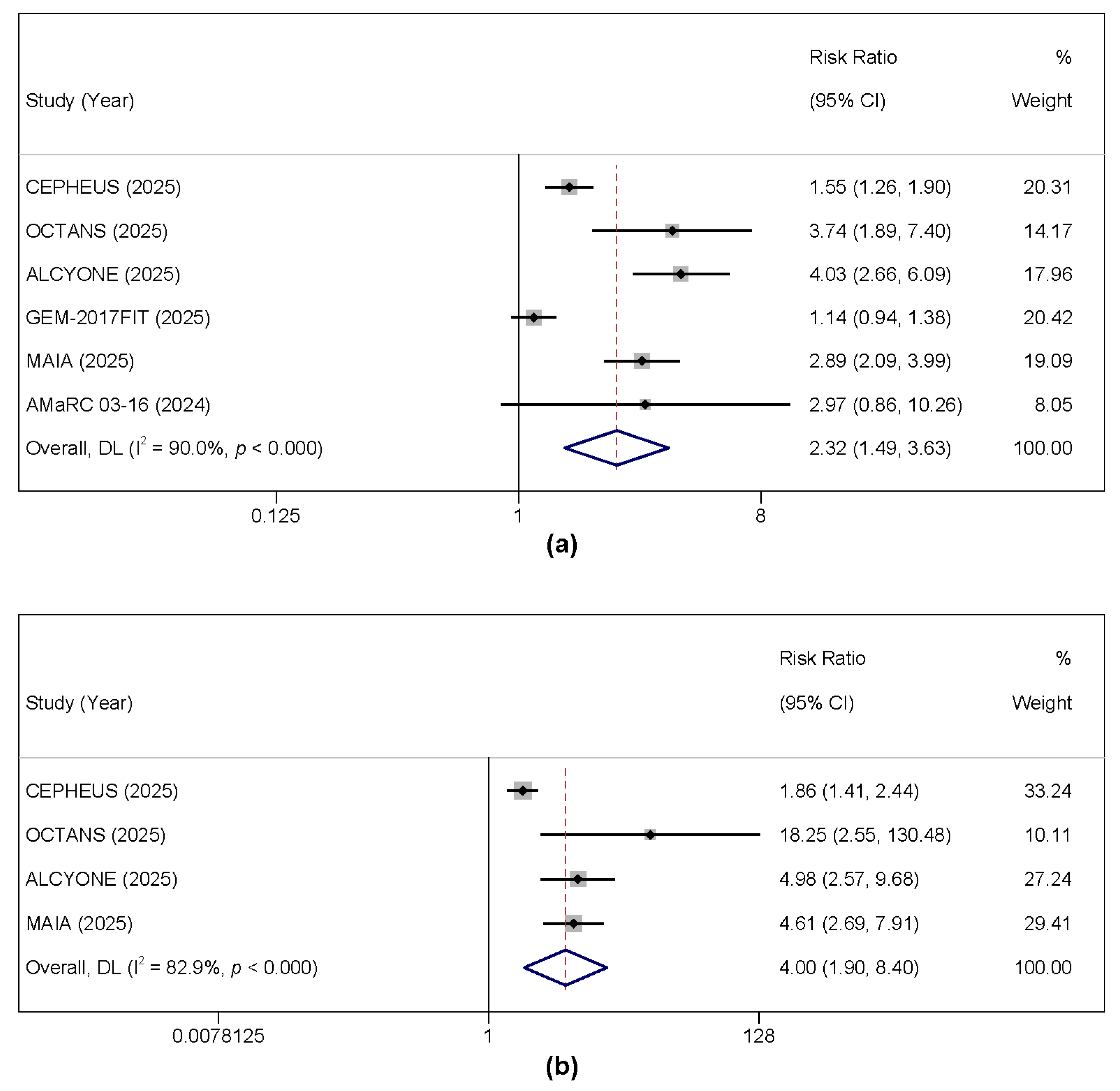 MRD negativity rates at a sensitivity threshold of 105 were reported in all included studies. A total of 500 out of 1278 (39.1%) patients in the daratumumab group achieved MRD negativity, compared with 238 out of 1208 (19.7%) in the control group. Daratumumab-based therapy was associated with a significantly higher MRD negativity rate (RR = 2.322, 95% CI: 1.486–3.627, p < 0.001). Substantial heterogeneity was detected (I2 = 90%, p < 0.001); thus, a random-effects model was used for this analysis (Figure 4a). Sustained MRD negativity (defined as MRD-negative status maintained for ≥12 months) is a key predictor of long-term outcomes. This was a pre-specified or exploratory endpoint in four of the six trials (MAIA, ALCYONE, CEPHEUS, OCTANS). We performed a meta-analysis on this endpoint, which demonstrated that daratumumab-based regimens significantly increased the rate of sustained MRD negativity by approximately four-fold compared to control therapies (pooled RR = 3.999, 95% CI: 1.094–8.403, p < 0.001; Figure 4b). Substantial heterogeneity was observed (I2 = 82.9%, p = 0.001), likely reflecting differences in study populations, backbone regimens, and follow-up duration. Despite this heterogeneity, the magnitude and consistency of the effect underscore the ability of daratumumab to not only deepen responses but also to confer remarkable durability (Figure 4b). Achieving sustained MRD negativity is increasingly recognized as a surrogate for long-term PFS and OS, making this finding particularly significant.