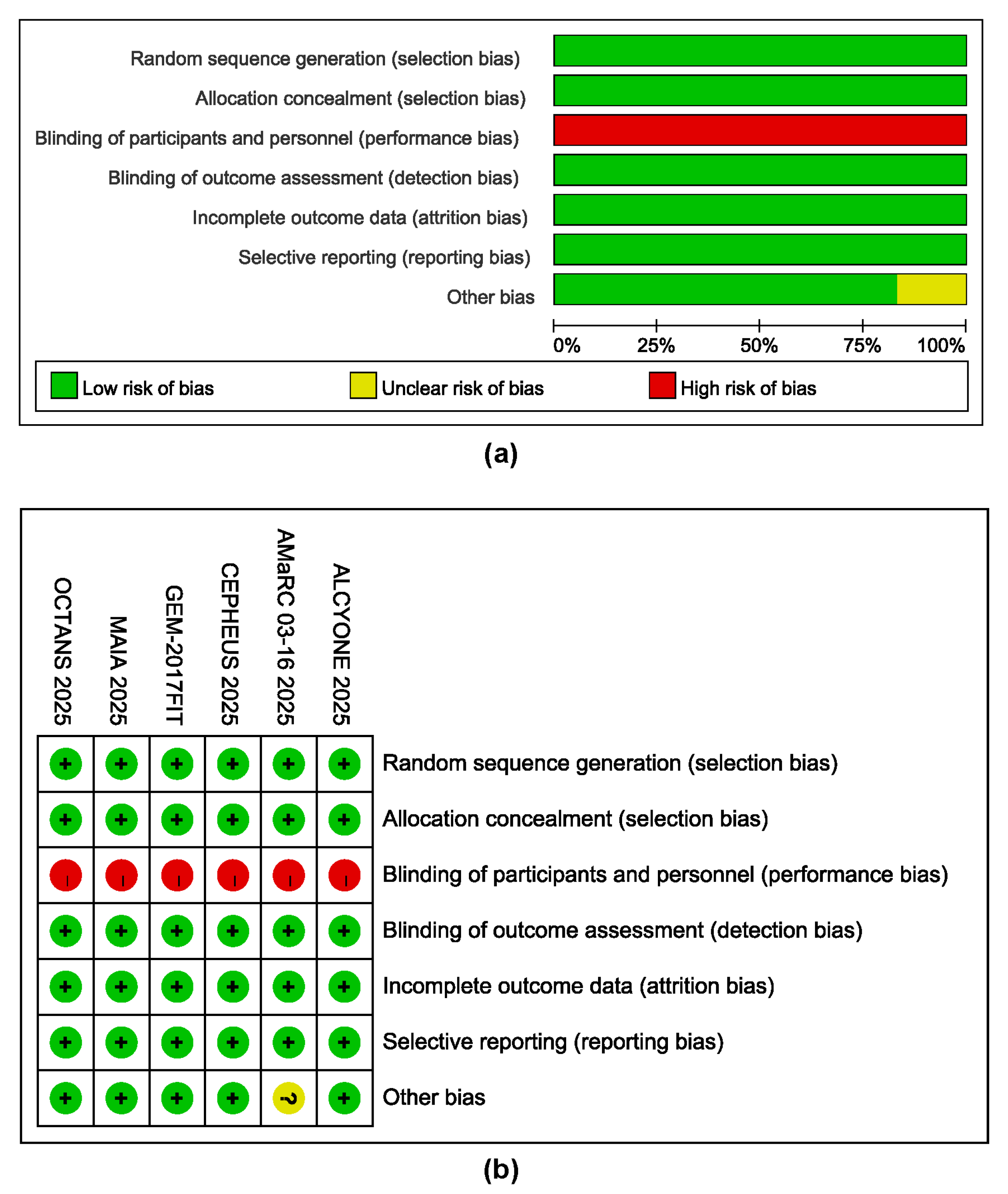 Two investigators independently extracted data using a standardized form, resolving disagreements by consensus or with a third reviewer. Extracted information included study metadata, participant characteristics, intervention details, and outcome data (PFS, OS, MRD negativity, and AEs). For safety outcomes, data on treatment-emergent adverse events (TEAEs) were extracted from the most detailed available report for each trial, which for key AEs was consistent with the longest follow-up. Specifically, serious adverse events (SAEs) were analyzed based on the definition provided by each individual trial, which typically encompasses events resulting in death, are life-threatening, require inpatient hospitalization or prolongation of existing hospitalization, result in persistent or significant disability/incapacity, or are important medical events. Study quality was assessed using the Cochrane Risk of Bias tool for RCTs [22].