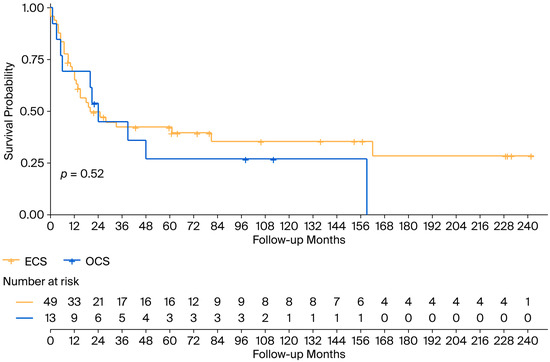 Fifty-two of the sixty-two GCS patients in our cohort underwent surgery, with twenty of the ECS receiving adjRT and forty-five patients (62.6%) receiving perioperative ChT. This multimodal approach (surgery + adjRT + ChT) is the current standard in locally advanced ECS. Platinum-based ChT was the perioperative ChT regimen administered in most of the patients, with carboplatin and paclitaxel [13,14] being the most frequent combination (23 patients), accounting for a better toxicity profile and non-inferior outcomes than other regimens administered, which were cisplatin and ifosfamide (6 patients) [15] or carboplatin and epirubicin (2 patients). Several studies focusing on newly diagnosed ECS patients also used carboplatin and paclitaxel [16,17]. However, only Hoskins et al.’s publication contains information on the disease relapse rate (33%) [16], which is similar to our study (31%). Two studies mention the different ChT regimens given to GCS patients, but they do not provide any information about the outcomes of the lines or the regimens used [18,19].
