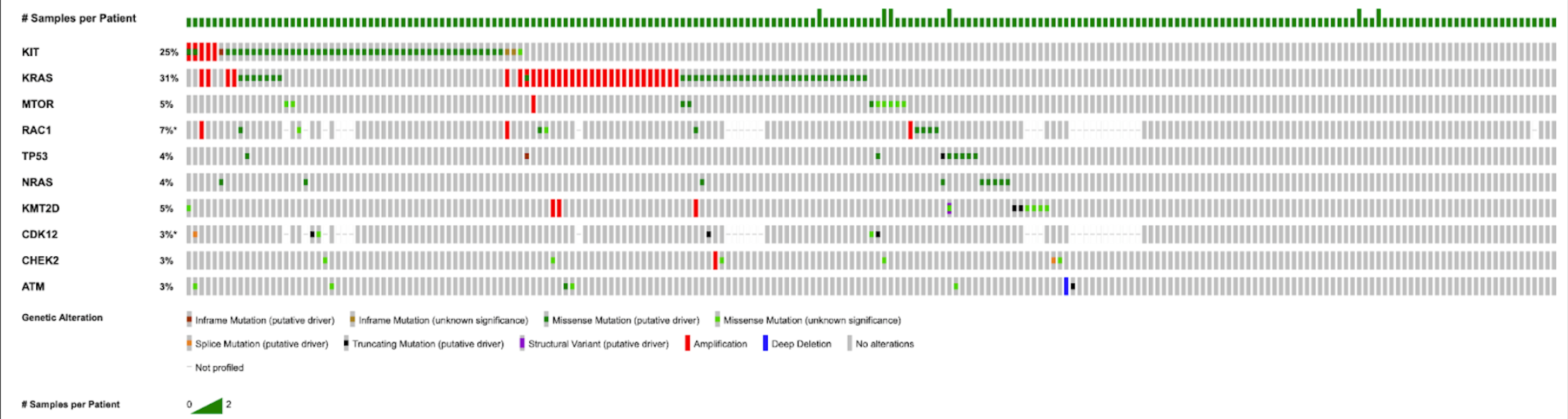 Figure 1 highlights the most frequently altered genes within this 217-person cohort. The gene KIT showed the highest mutation rate (n = 49, 22.6%), followed by KRAS (n = 37, 17.1%). Other commonly mutated genes included MTOR (n = 11, 5.1%), RAC1 (n = 9, 4.1%), TP53 (n = 9, 4.1%), NRAS (n = 9, 4.1%), and KMT2D (n = 9, 4.1%), as well as EP300 (n = 7, 3.2%). Less frequent but still notable were CDK12 (n = 6, 2.8%), CHEK2 (n = 6, 2.8%), and ATM (n = 6, 2.8%). Overall, mutations in genes associated with cell signaling and regulation were recurrent, with KIT and KRAS standing out as the most significantly altered in this dataset.