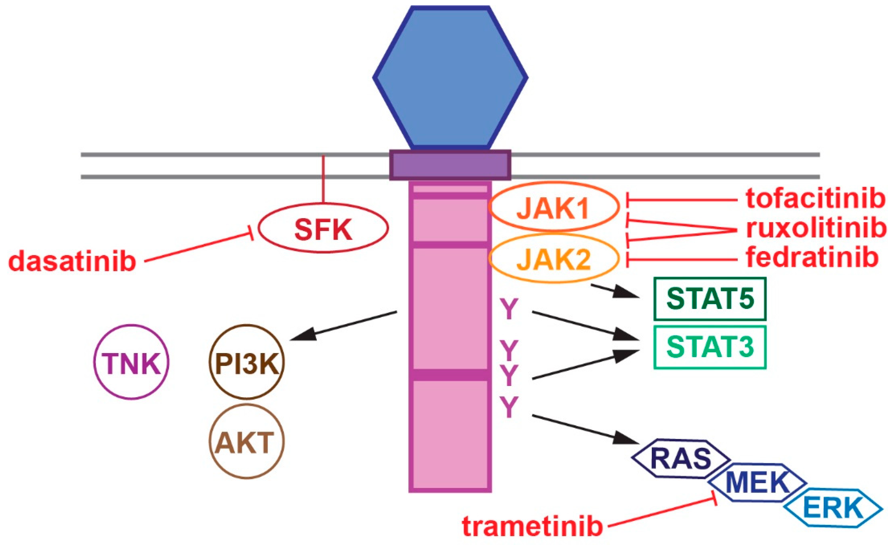 - Nicholson, S.E.; Oates, A.C.; Harpur, A.G.; Ziemiecki, A.; Wilks, A.F.; Layton, J.E. Tyrosine kinase JAK1 is associated with the granulocyte-colony stimulating factor receptor and both become tyrosine phosphorylated after receptor activation. Proc. Natl. Acad. Sci. USA 1994, 91, 2985–2988. [Google Scholar] [CrossRef]