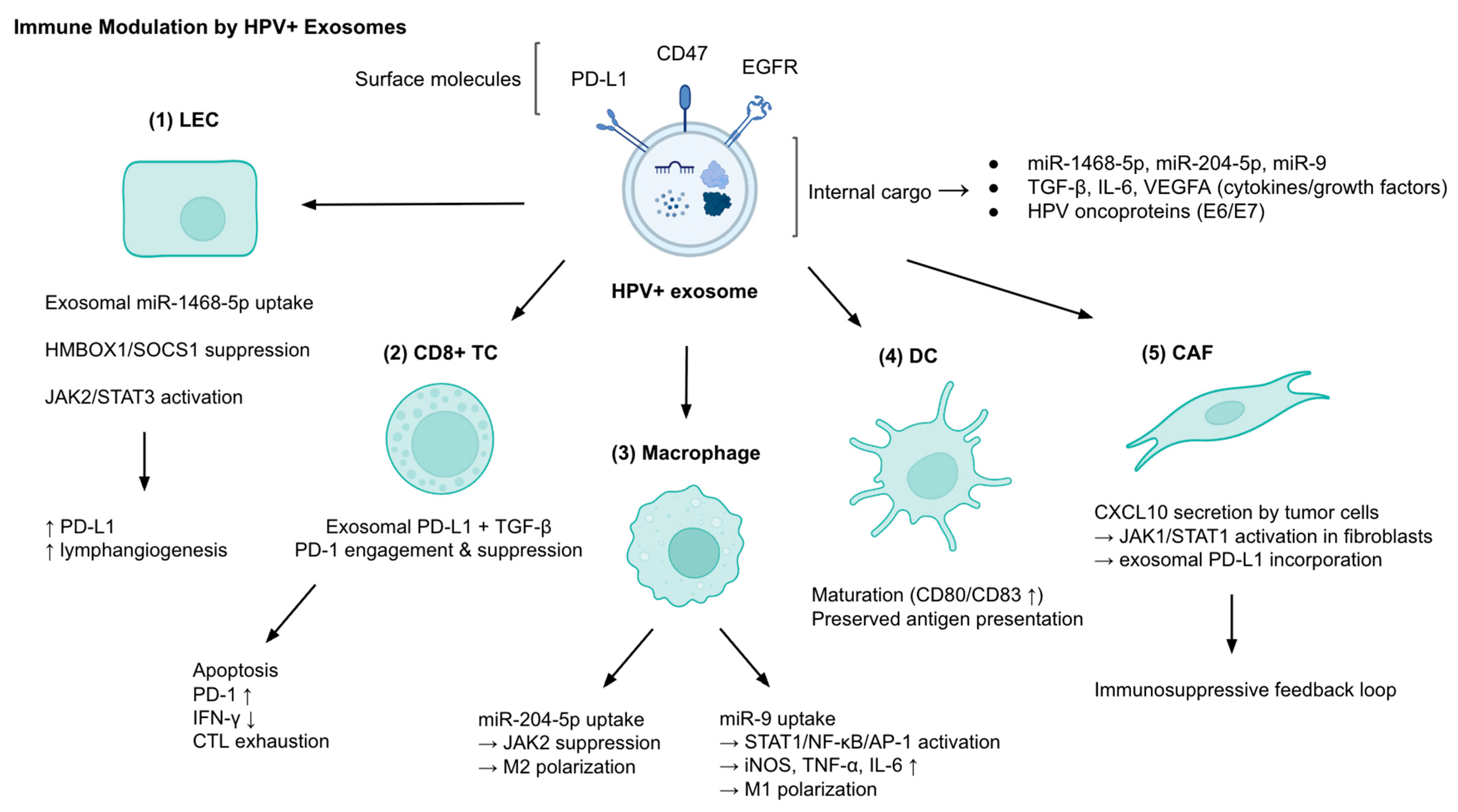 Viral RNAs (E6/E7), EGFR, miR-205-5p vs. MUC-1, HLA-DRA, miR-1972 | HPV+ vs. HPV− HNSCC exosomes | DCs | HPV+: promote DC maturation; HPV−: inhibit antigen presentation | |